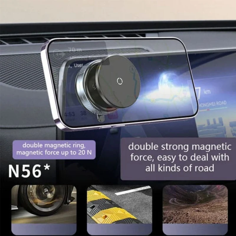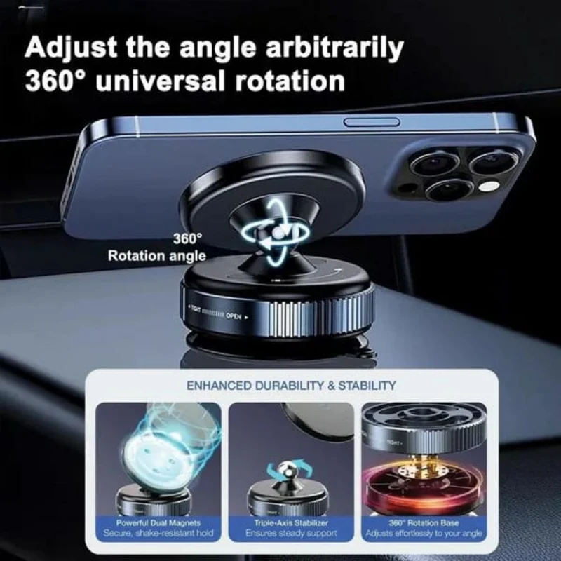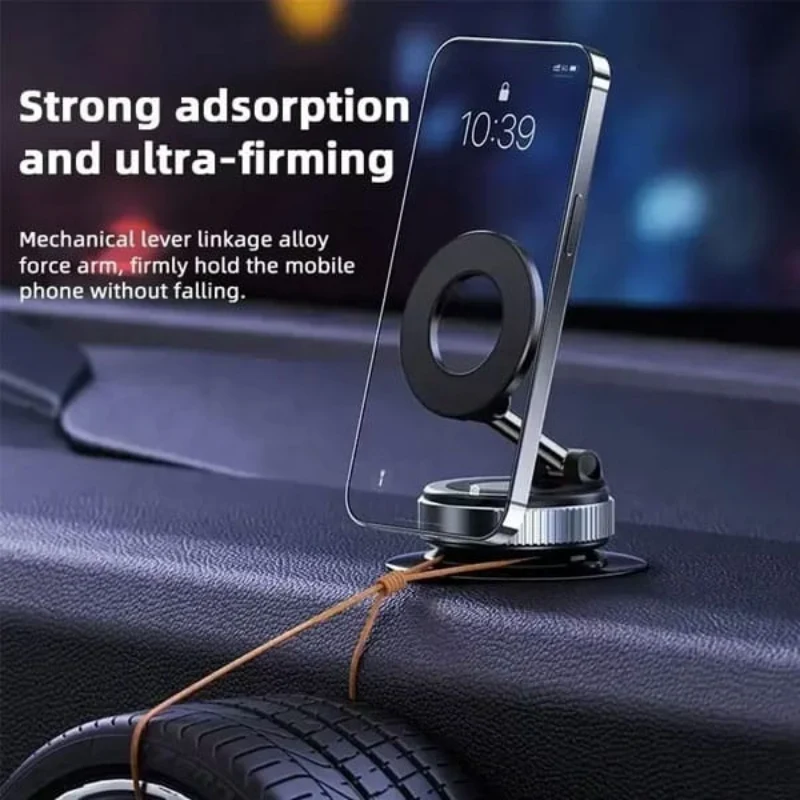 The car phone mount stands out for its dual holding mechanism vacuum suction plus magnetic adsorption ensuring maximum stability even on bumpy roads. Its high-strength alloy construction, compact design, and universal compatibility make it perfect for both driving and desk use.